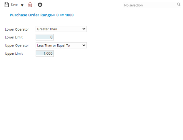 . A pop up window will appear which will allow the creation or amendment of a Purchase Order Range and Limit.