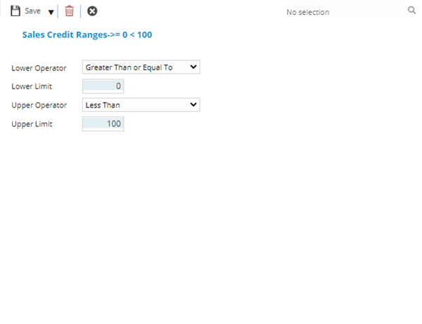Note: Once the ranges have been created the must be assigned to User Accounts and / or Roles and Contract - Sales Credit Ranges and Limits if the Sales and Credit Preferences have been checked.