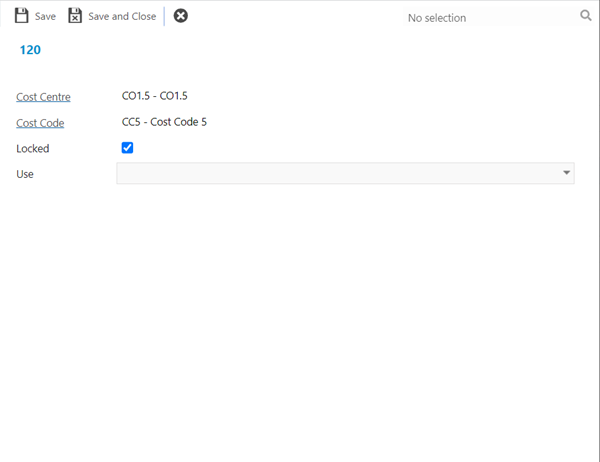 Open a record in the grid to update the Locked checkbox or set the specific Use value(s) for the Cost Code within the current Cost Centre.