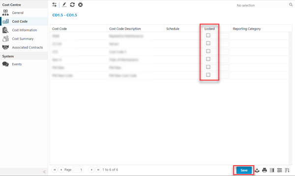 Cost Codes can be marked as Locked with regard to the current Cost Centre. 'Locked' Cost Codes are excluded from the list of available Cost Codes for the Cost Centre.