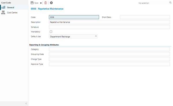 Cost Codes represent elements of Costs that can be associated with Cost Centres. A single Cost Code may constitute an element of Cost against more than one Cost Centre. For example, Cost Codes for reactive and planned maintenance may be used to monitor how much each Building or Department is spending on their upkeep.