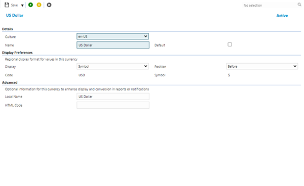 The Currency will be displayed in input pages, grids and reports.