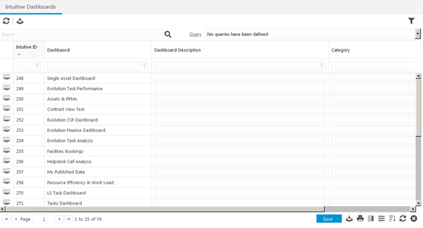 Intuitive Dashboards show all the dashboards that have been designed within Intuitive BI and imported into MRI Evolution. These dashboards can be used to create Intuitive Dashboard Widgets.