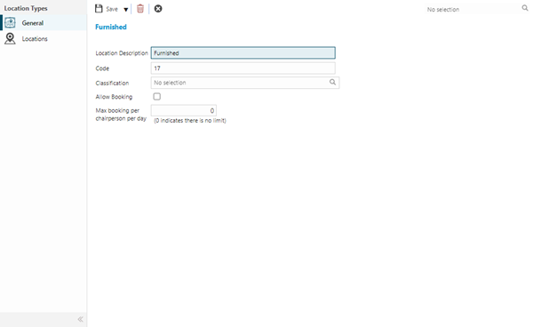 Adding a Location Type to a Location is what makes the room bookable. To aid with room booking and filtering different Location types can be added e.g. meeting room, training room or hot-desk.