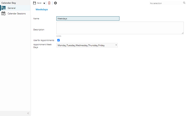 Calendar Sessions are used to create Calendar Days. Days may be single or multiple Sessions, they may have gaps such as 09:00 - 12:00 then 13:00 - 17:00 but they may not overlap.