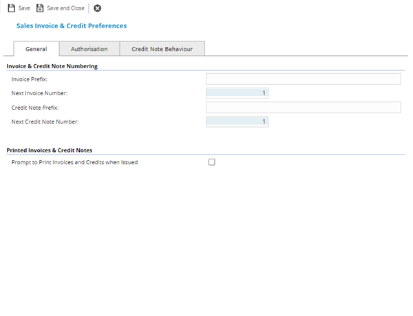 Within the System Invoice and Credit Preferences, definitions can be set for Invoice and Credit Note prefixes, numbers and authorisation models.