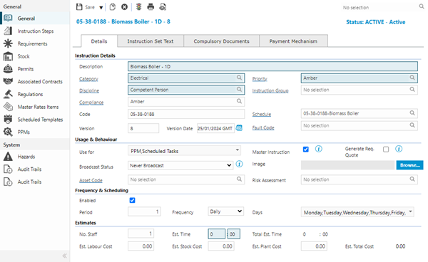 Instruction Sets can be used for anything from generic guidelines for performing Tasks to a very specific set of instructions to be followed during Planned Maintenance for PPM Tasks. Adding the number of Staff required to carry out a Task and the Estimated Time and Costs related to a Task, will provide more accurate information for planning of budgets and Staffing levels.