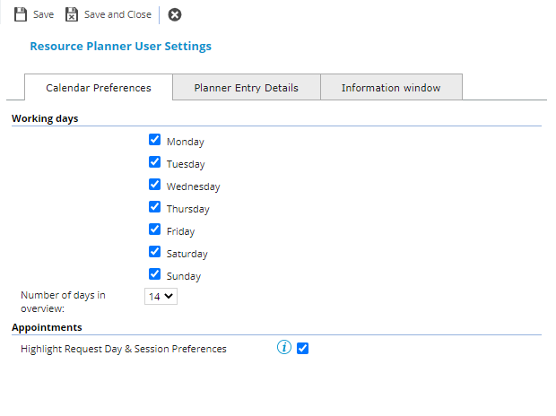 Highlight Request Day & Session Preferences check box - enables or disables the functionality to highlight the preferred appointment Calendar Day and Calendar Session in the Resource Planner.