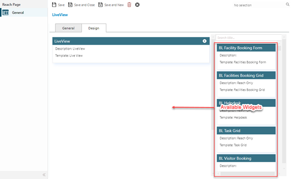 Open the Design Tab, drag the widget(s) from the list of Available Widgets into the required position on the page.