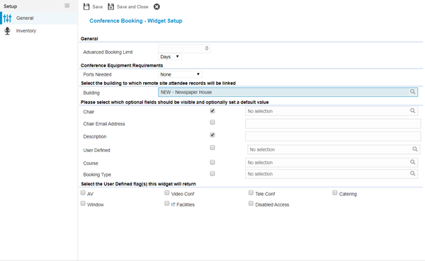 Select the Widget template : Conference Booking. Complete the fields and click Save