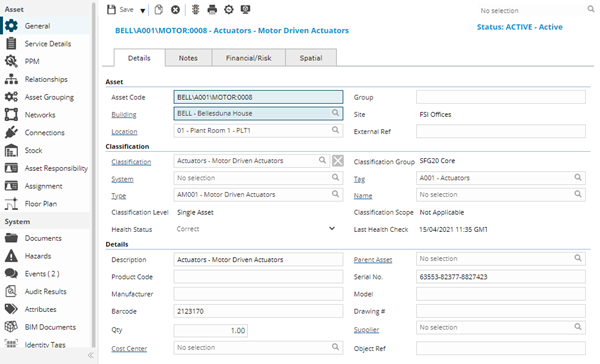 Note: In version 4.7 onwards the order of the Asset fields was altered and the spatial tab was added