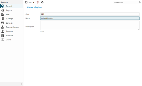 Countries can be added to many entities within MRI Evolution. These entities include Resources, Suppliers, Sites, Contacts, Buildings, External Contacts, Clients and Regions.