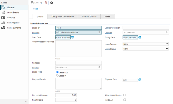 The Lease Register allows Users to define any number of Leases against a particular Building or Location. Once a Lease Register has been created, details of the rents payable are recorded in the Rent Register.