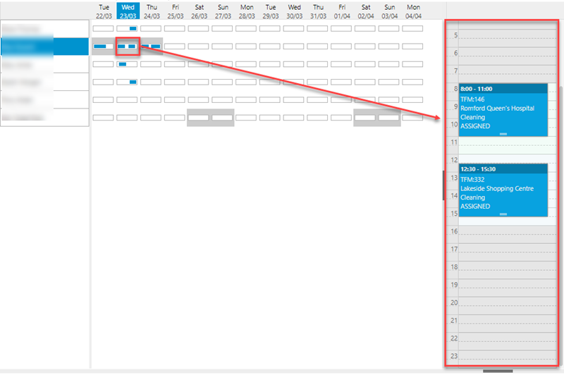 Resource's availability is shown as white if they are available and grey if they should not be available. - Rotas, Calendars or Resource Planner Preferences must be in place for this colouration to show.