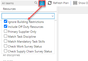 When this option is toggled OFF, the list of Resources include those that have Skills that do not match the mandatory Skill Requirements of the current Task. Note: It is possible to assign Resources to Tasks where the Resource does not meet the Skill Requirement, in a similar way that Building assignments can be bypassed. |