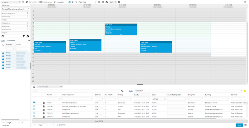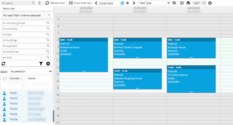 Tasks can be assigned by dragging them from the Task grid on the appropriate slot in a Resource's Diary, creating a Task Time Record.