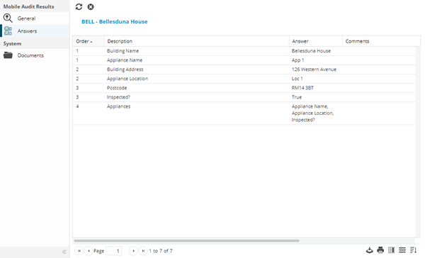 | Answers Grid | The Answers grid displays the Mobile Audit Questions and the Answers provided |