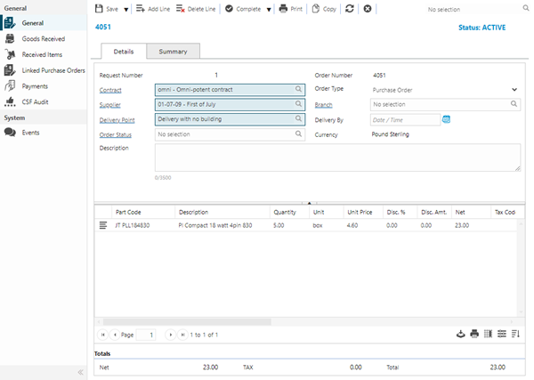 Once a Purchase Order Header has been created, the Line Items for the goods on order can be added. If the Purchase Order module is being used in conjunction with the Stores model, specific parts, using the Stores codes can be ordered.