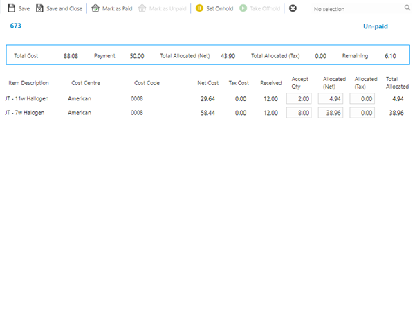 Enter the quantity of received items that are being accepted in the Accepted Qty field. The Allocated (Net) and Allocated (Tax) amounts will be auto-populated, these can be manually edited if the payment being allocated is not the full amount available. Complete the fields and click Save