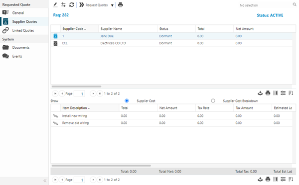 The link will open the Requested Quotes / Supplier Quotes grid. It is a two grid view which can be sorted and customised as normal. The upper grid will show all Suppliers assigned to the Requested Quote. The lower grid will show the Supplier costs for the Supplier highlighted in the upper grid.