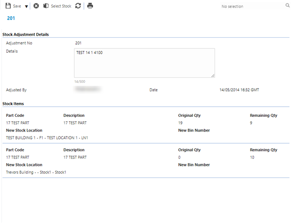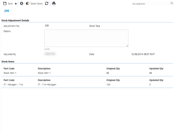 . Once the Stock Adjustment header has been completed and saved, Stock can be added to adjust.