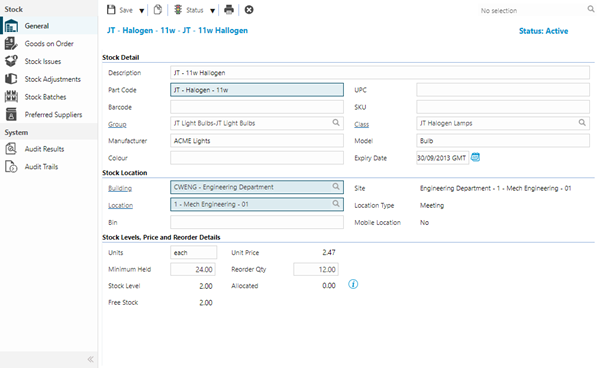 Each Item of Stock that is ordered for any Building can be recorded in the Stores Register. The Stores Register keeps track of the Locations of each Item and the quantity of that Item in that Location. It also keeps track of re-ordering information, such as the name of the manufacturer, the model type, bar code, quantity to be requested when an order is raised and the minimum level of Stock that can be reached before a new order is required.