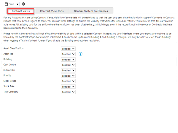 The Contract Views tab allows a system administrator to enable or disable Contract View restrictions against MRI Evolution entities on an entity by entity basis.