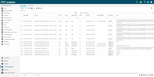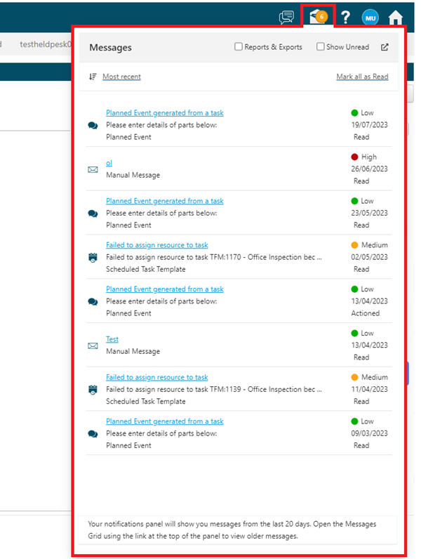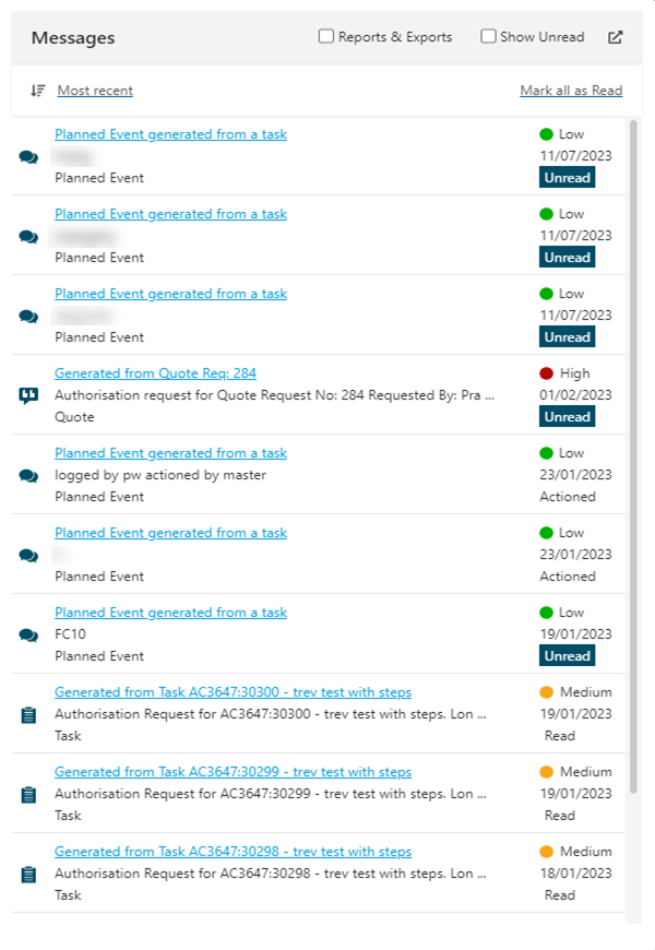 Note the Messages shown have been generated from various sources, are of high, medium and low priority and there's a mixture of actioned, read and unread Messages: