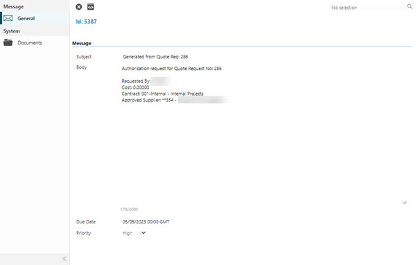 View Source | Select a Message in the grid and click to directly open the record where the selected Message originates from, such as a Task or Quote that requires Authorisation. |