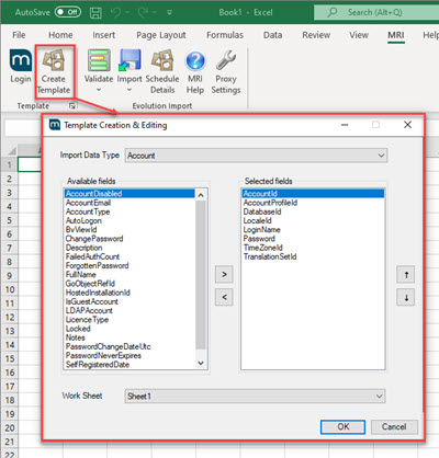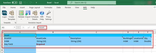 The Template will contain all mandatory fields for the MRI Evolution entity plus any optional fields selected by the user to be populated as part of the data import.